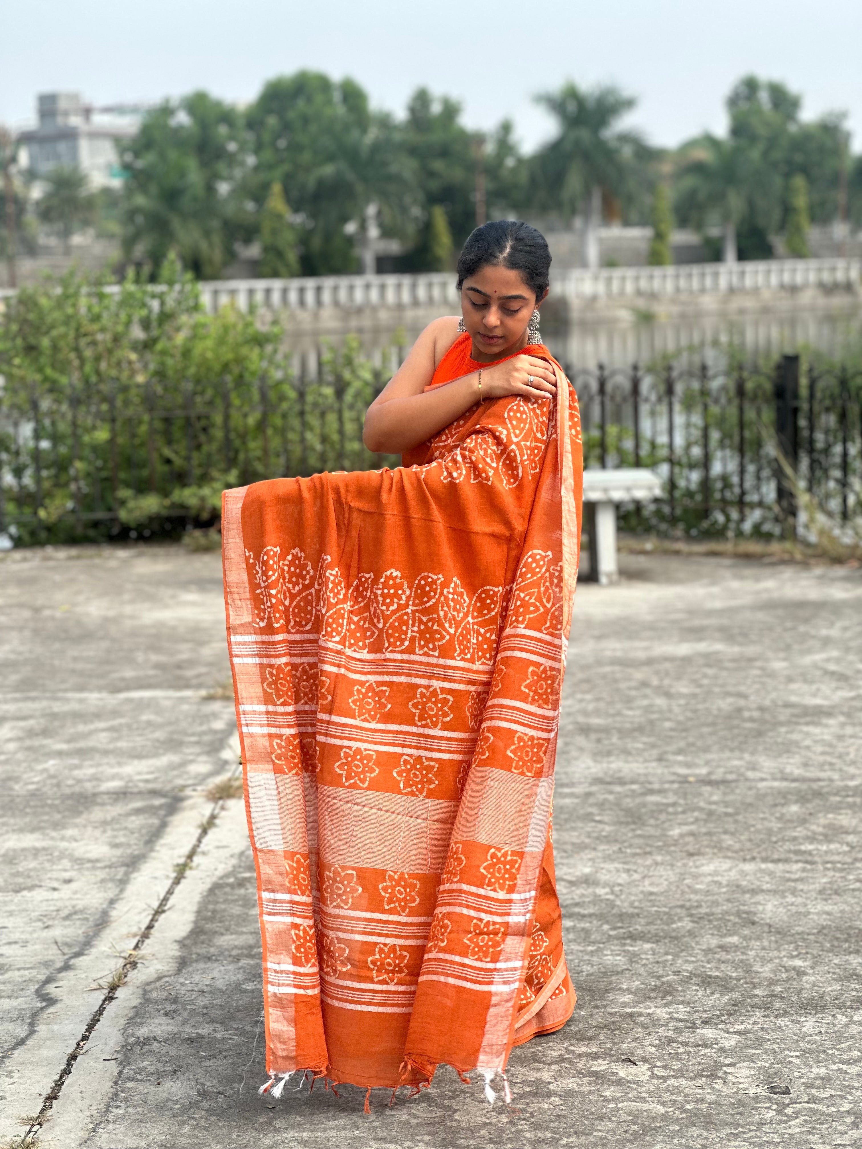 Embrace the earthy elegance of this burnt orange batik saree, crafted from fine linen that drapes gracefully. The rich burnt sienna hues capture the warmth of autumn, while intricate batik patterns add artistic sophistication. Ideal for festive occasions or casual gatherings, this saree blends comfort, style, and timeless beauty.