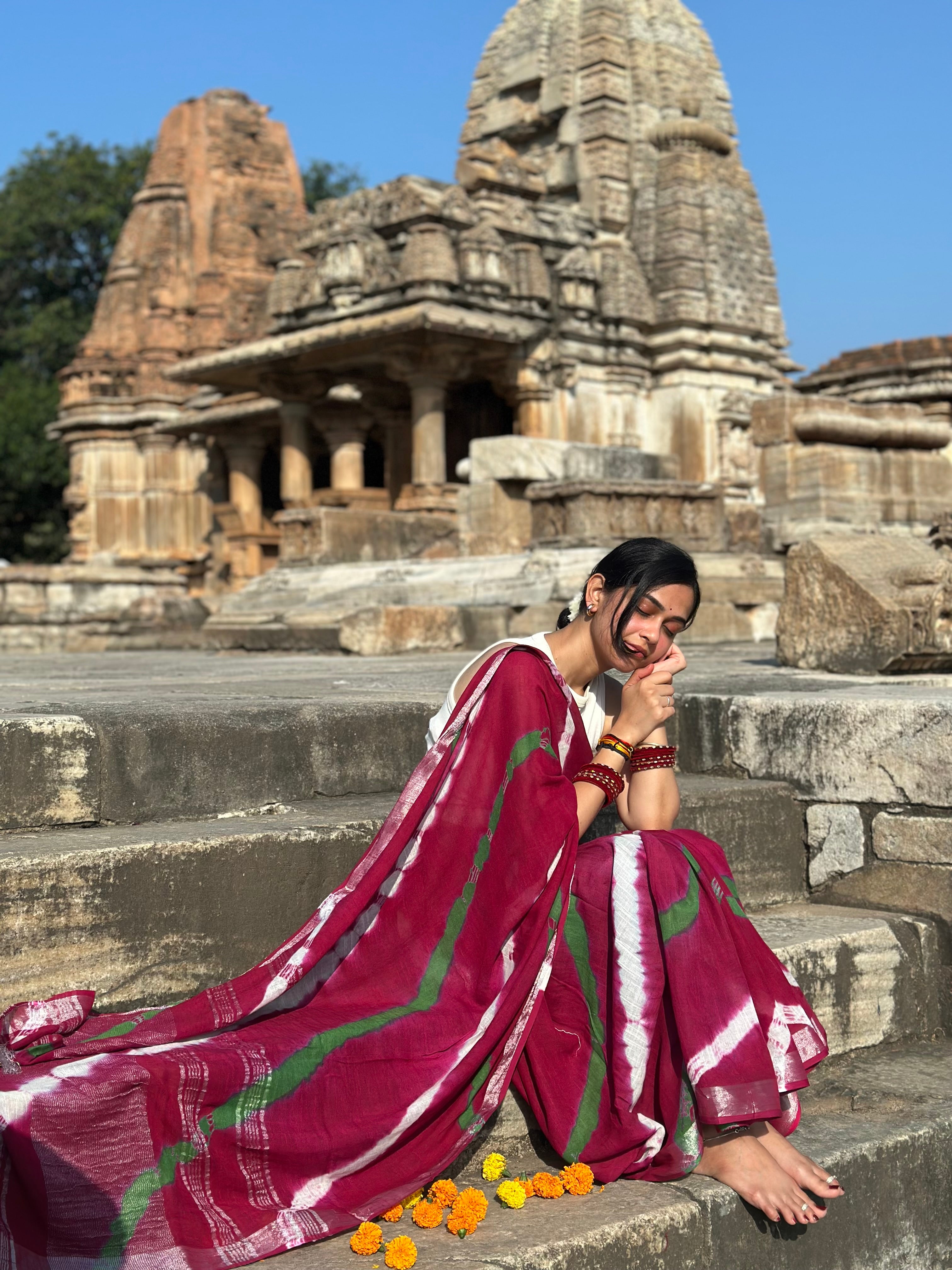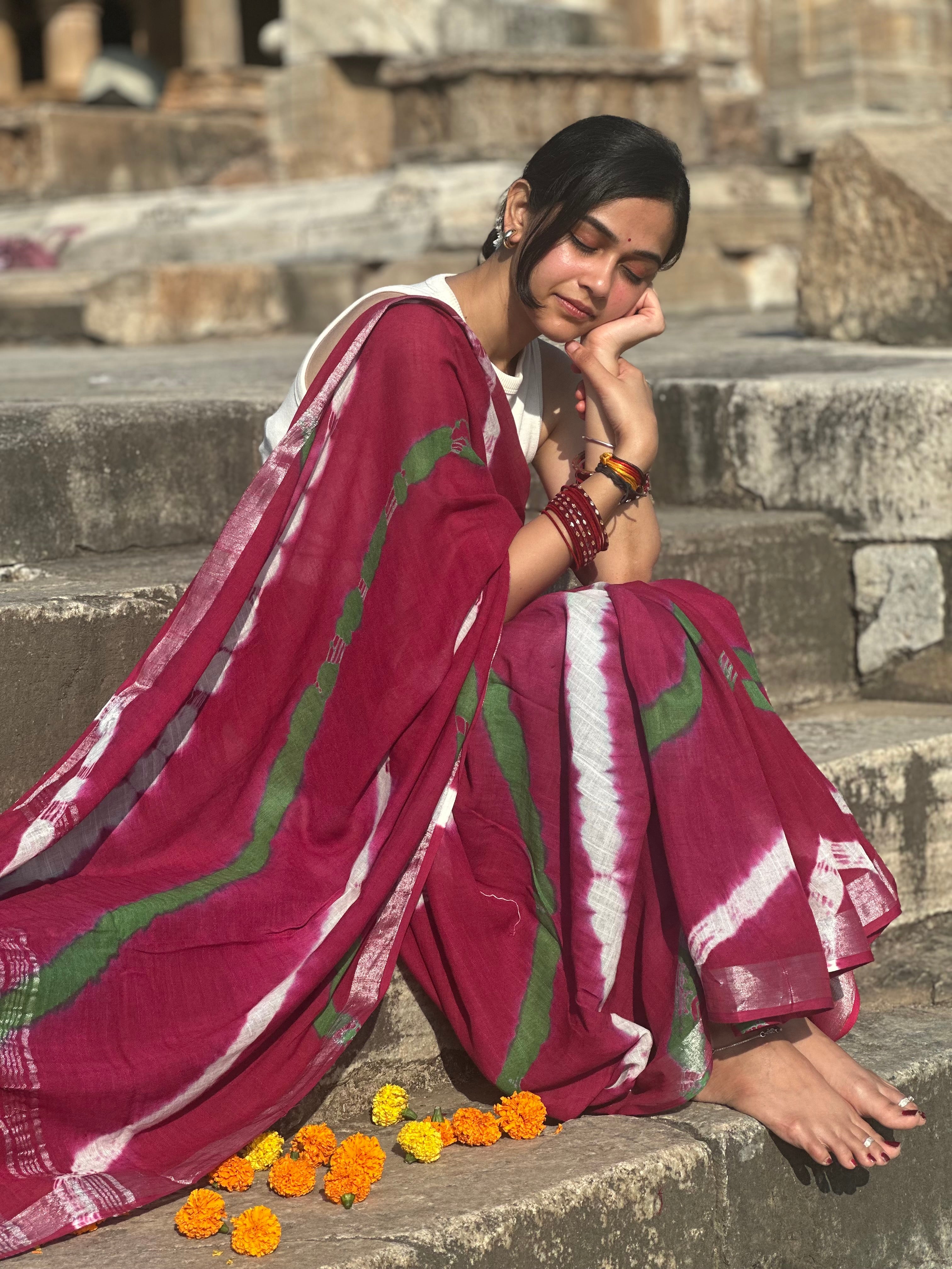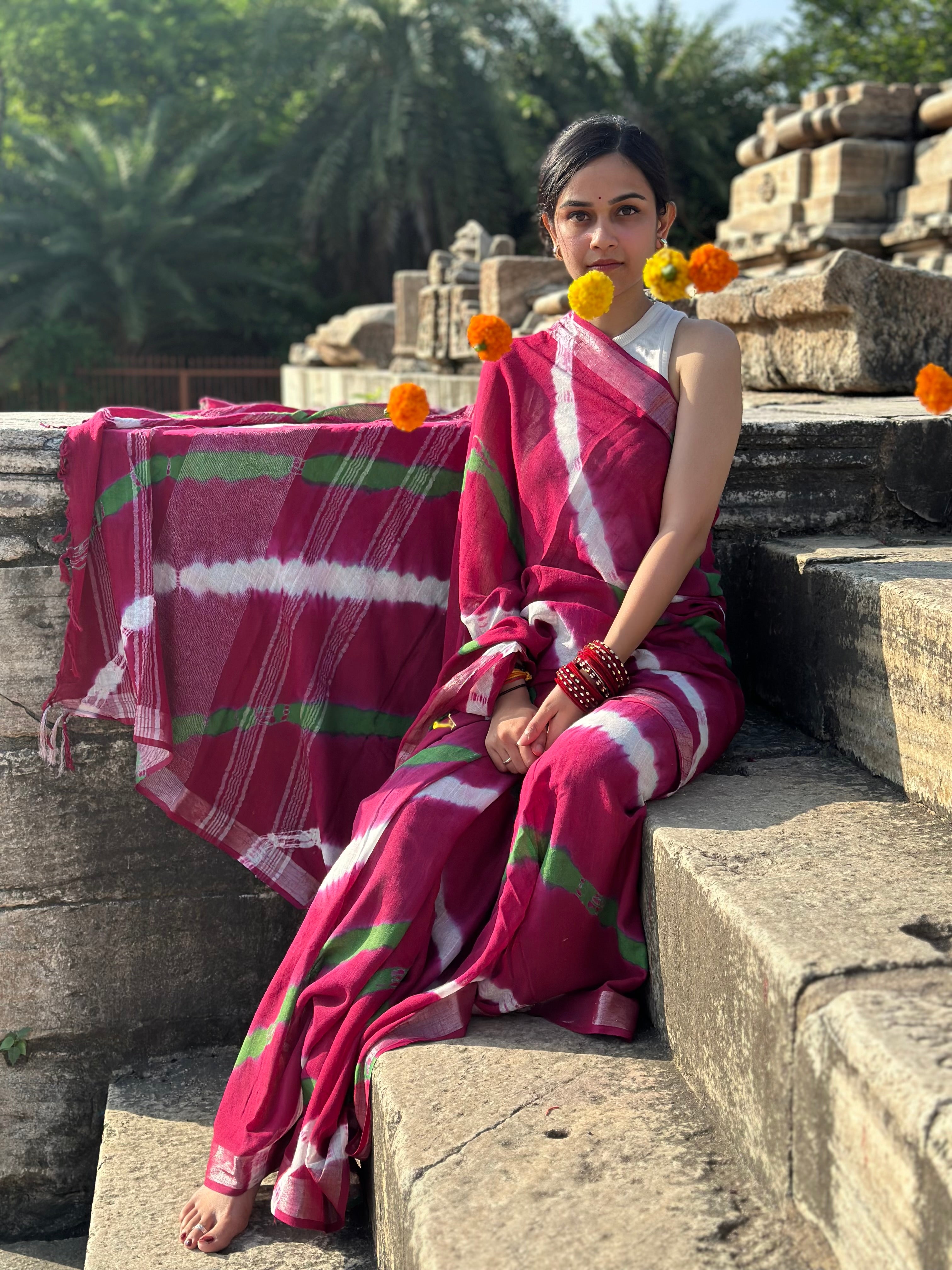Step into a vibrant world with this pink tie-dye linen saree, featuring bold green and white stripes. Its soft, breathable fabric offers playful charm, evoking springtime bliss. The lively pink tones paired with fresh green accents mirror blooming daisies basking in sunlight, making this saree a refreshing celebration of nature’s beauty.