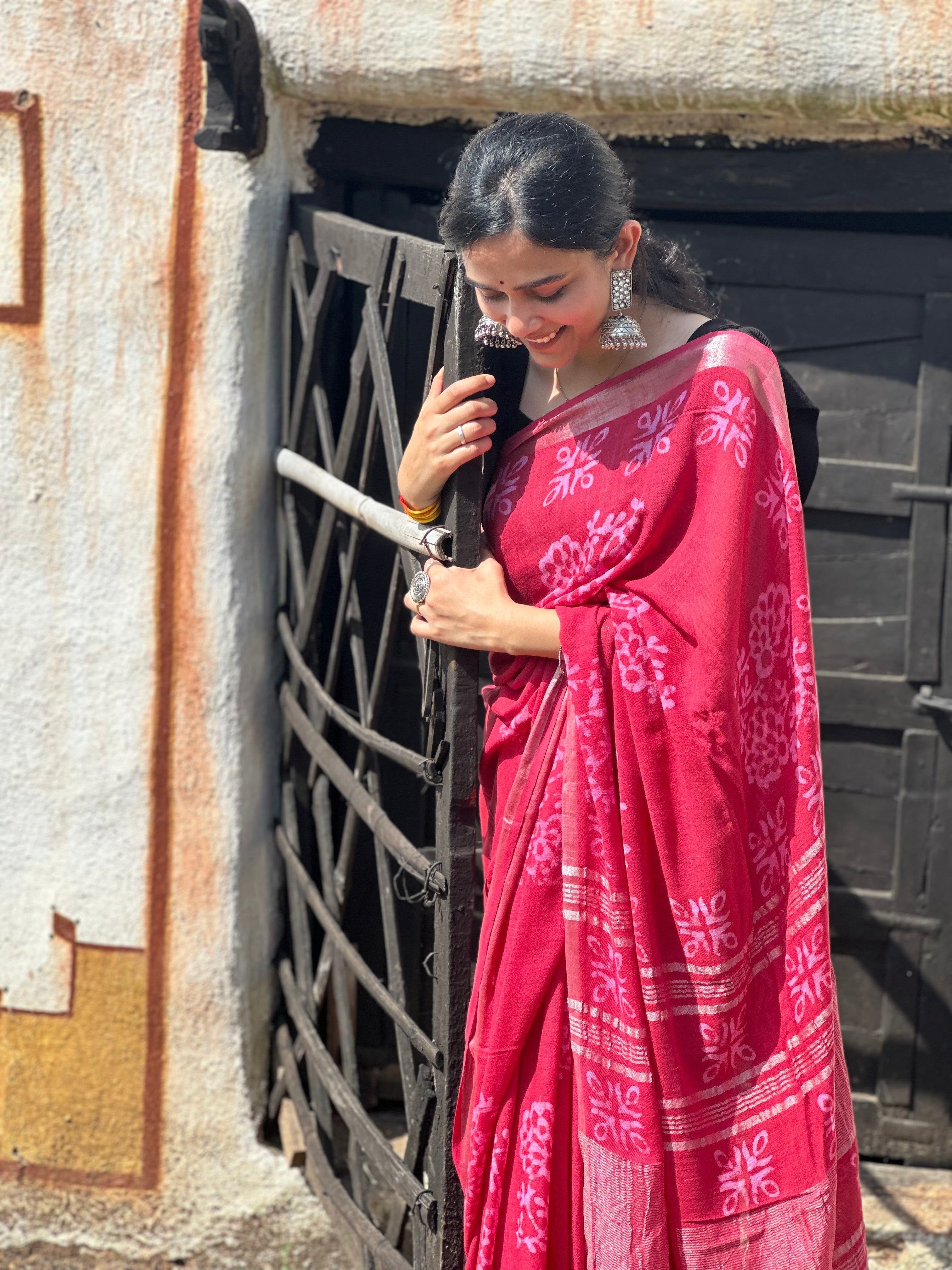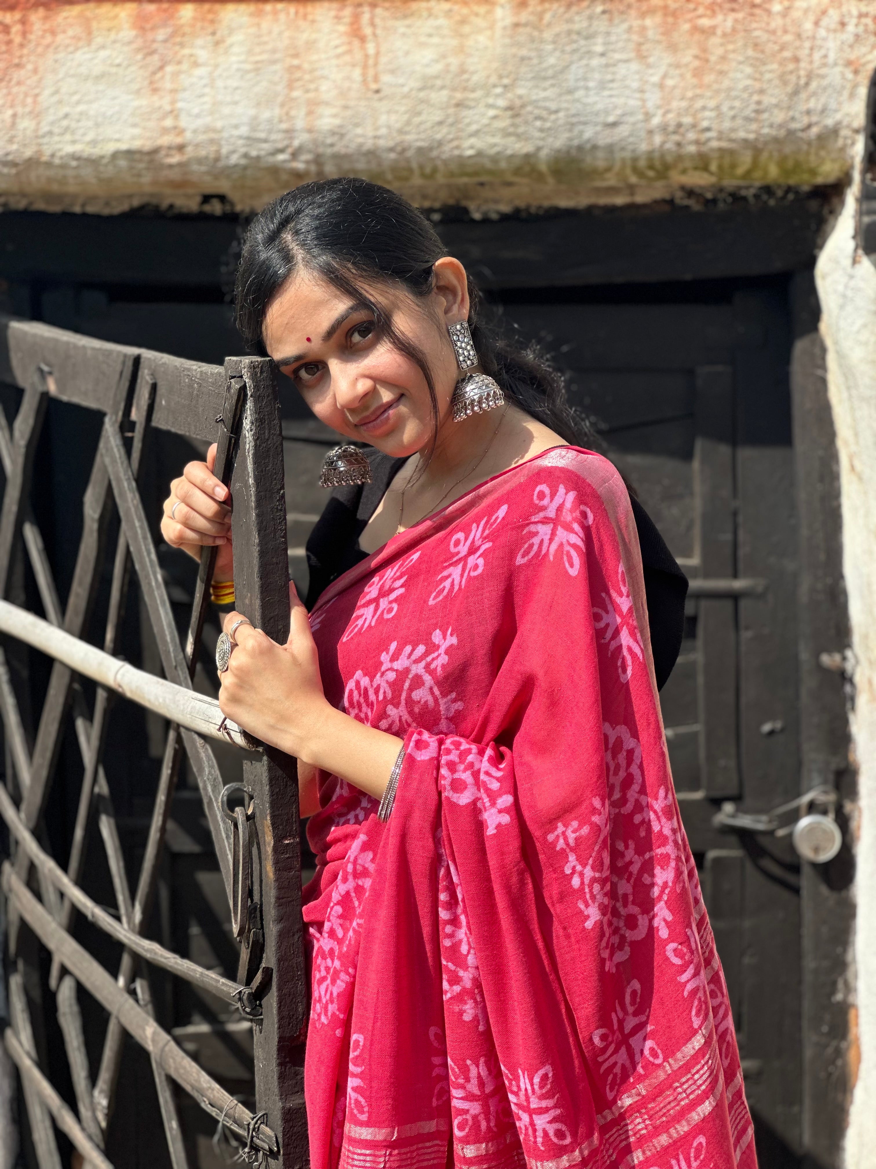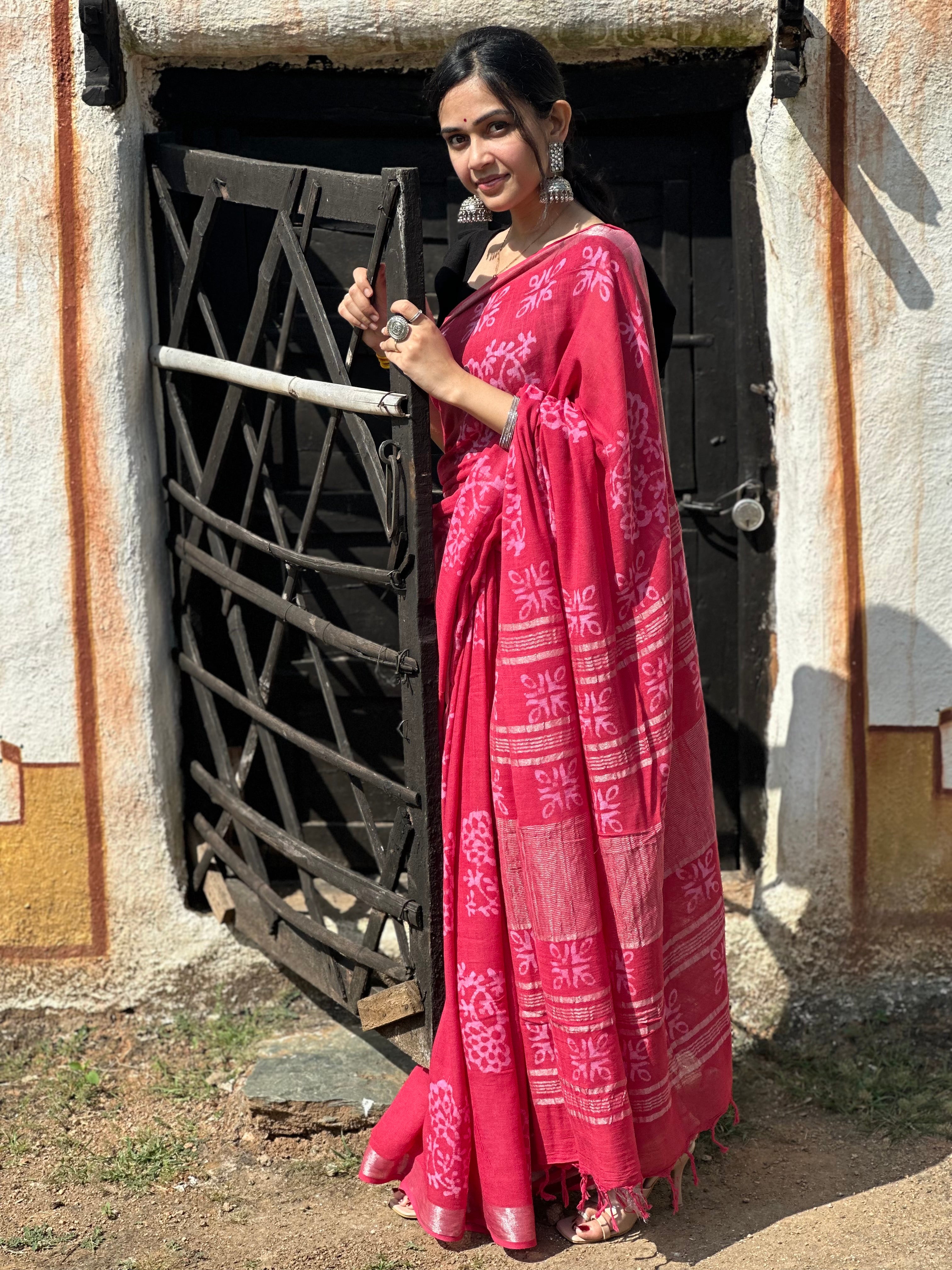 Make a bold statement with this stunning hot pink batik saree, crafted from luxurious linen that drapes effortlessly. The vibrant fuchsia hue is enhanced by intricate batik patterns, reflecting traditional craftsmanship. Perfect for festive occasions or events where you wish to stand out, this saree combines boldness with elegance.