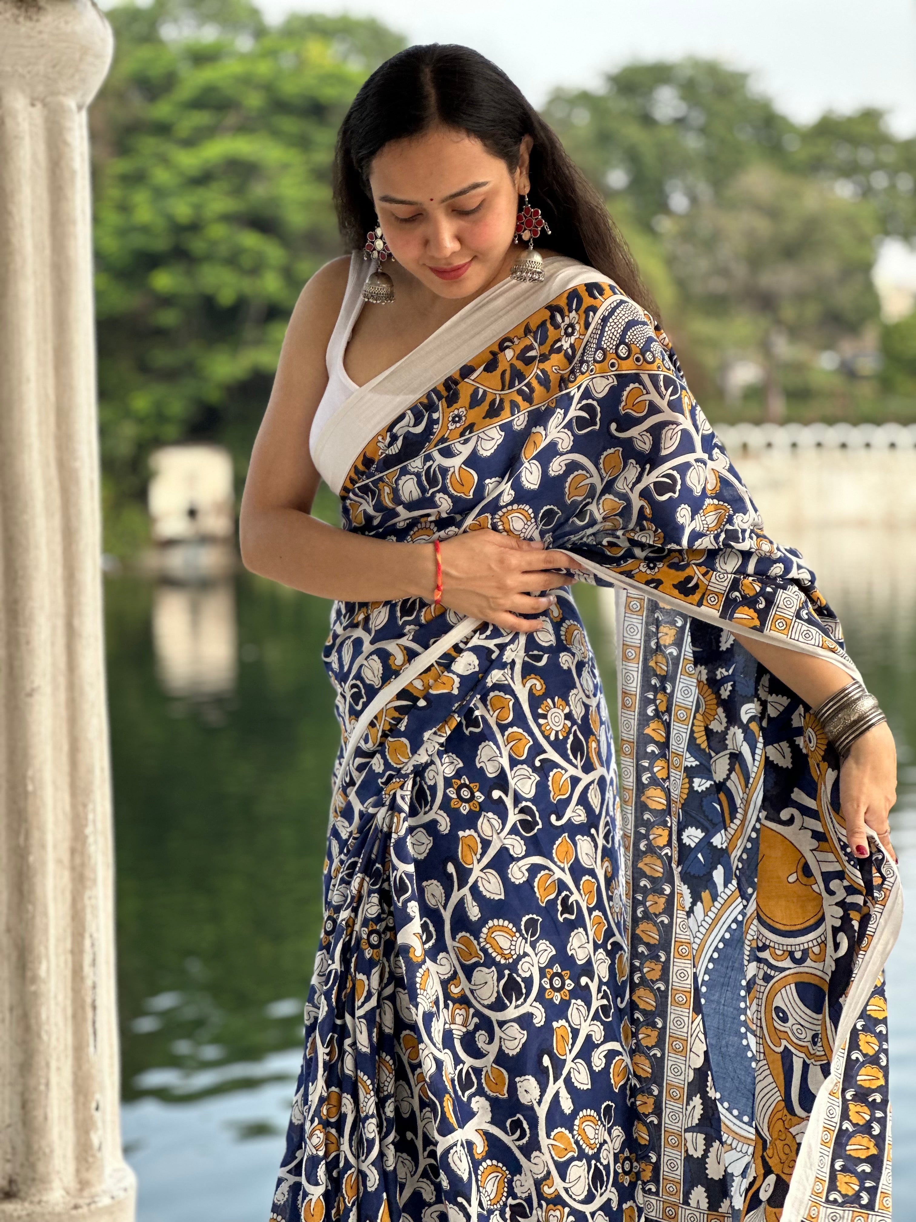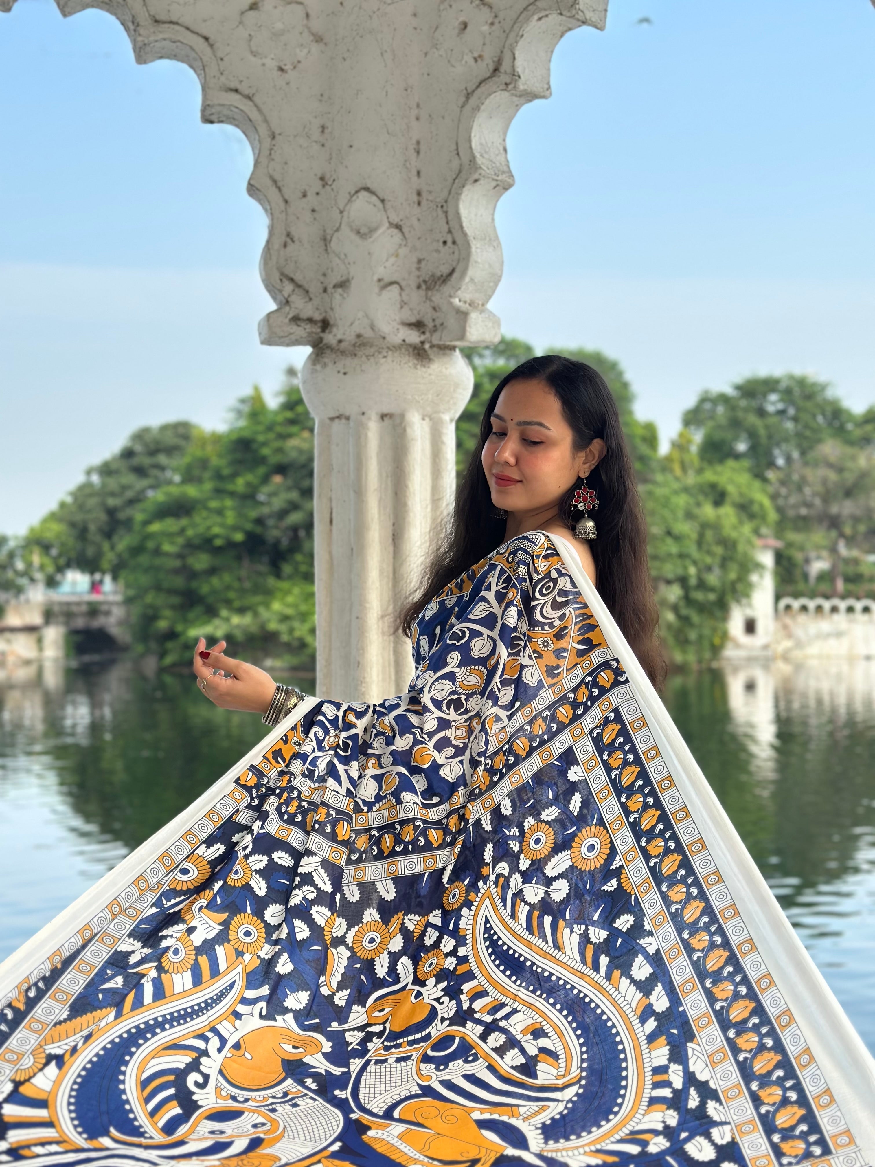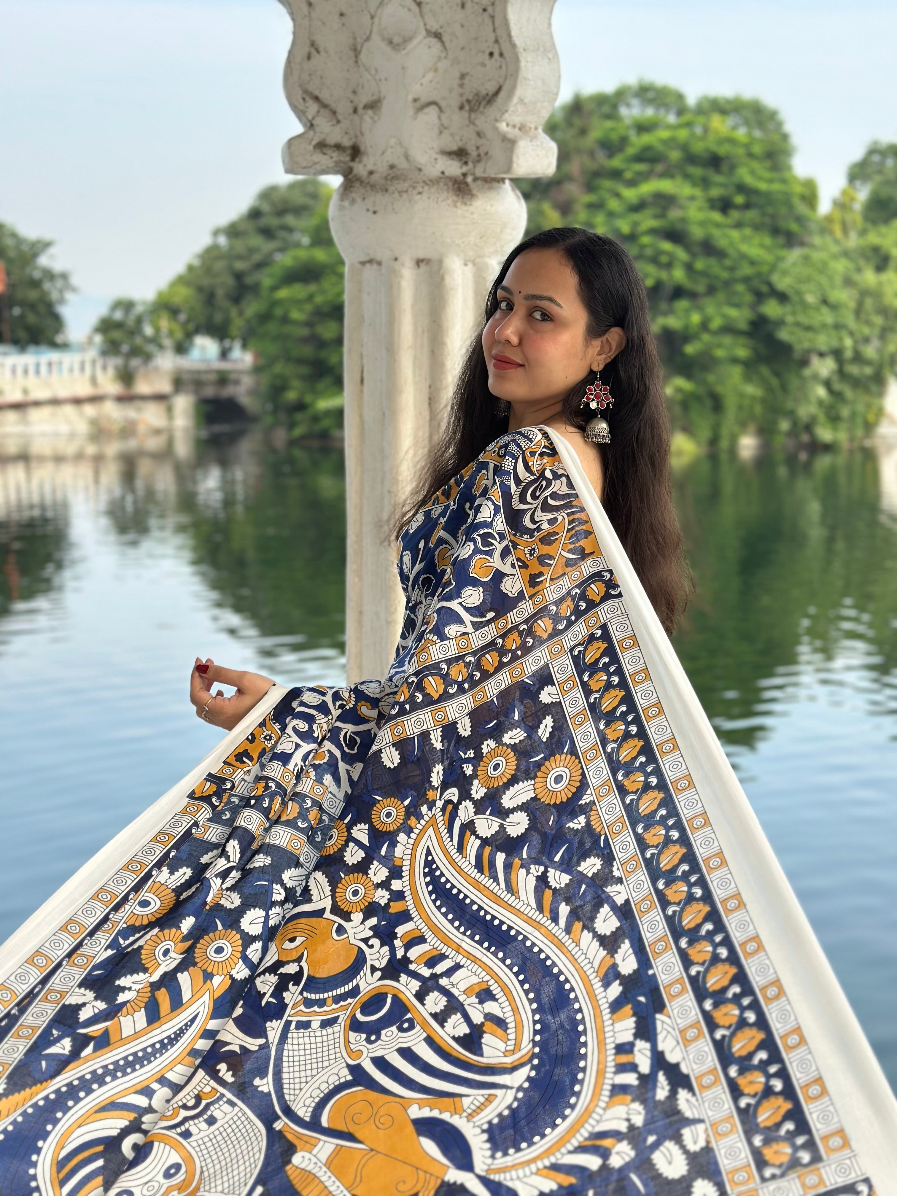 Experience the captivating allure of this kalamkari saree, where a delicate white base complements intricate blue motifs. Each design tells a story, blending nature's tranquility with artistic expression. The serene blue hues evoke calm, making this saree perfect for festive occasions or everyday elegance, blending tradition with modern sophistication.