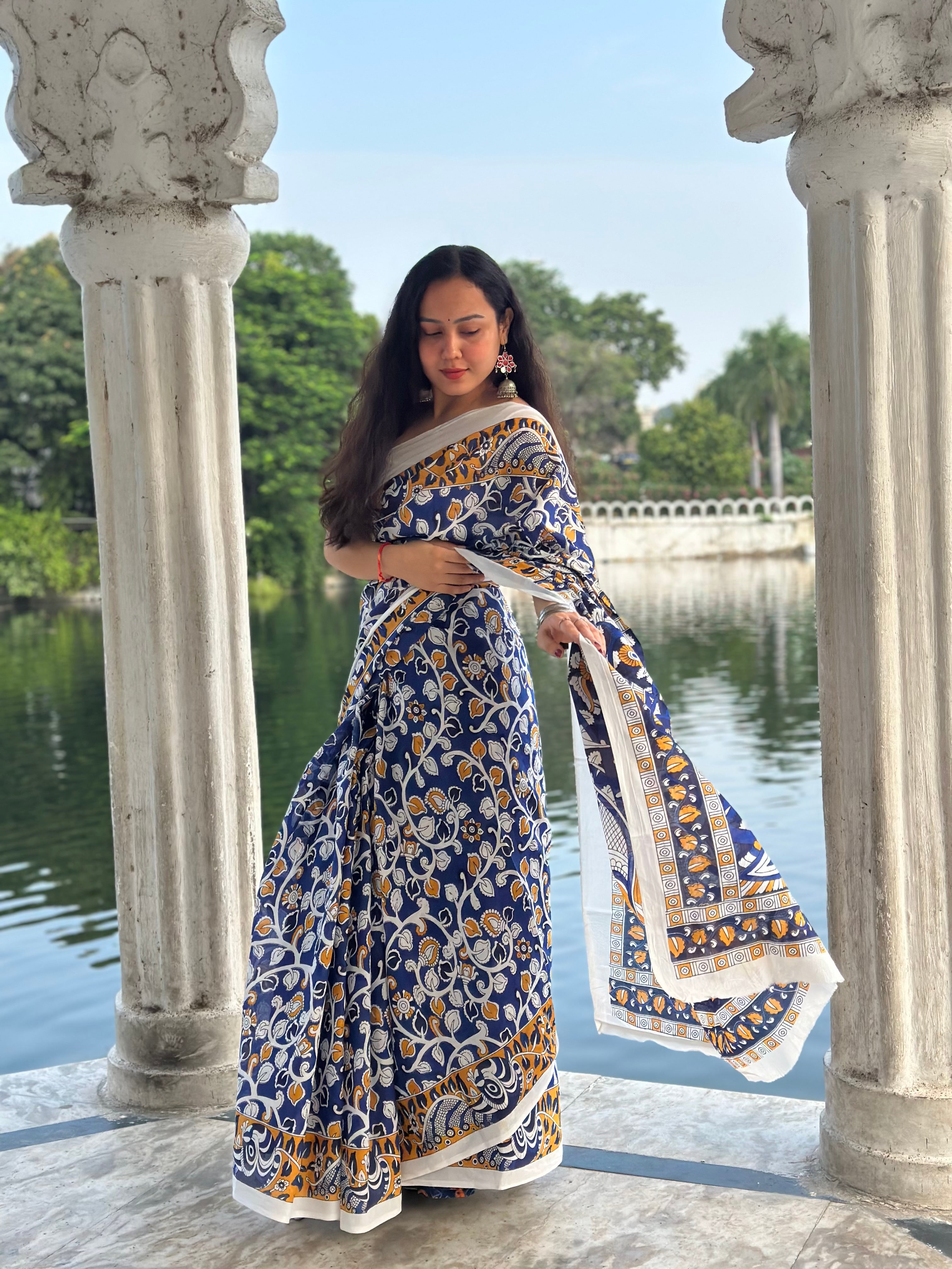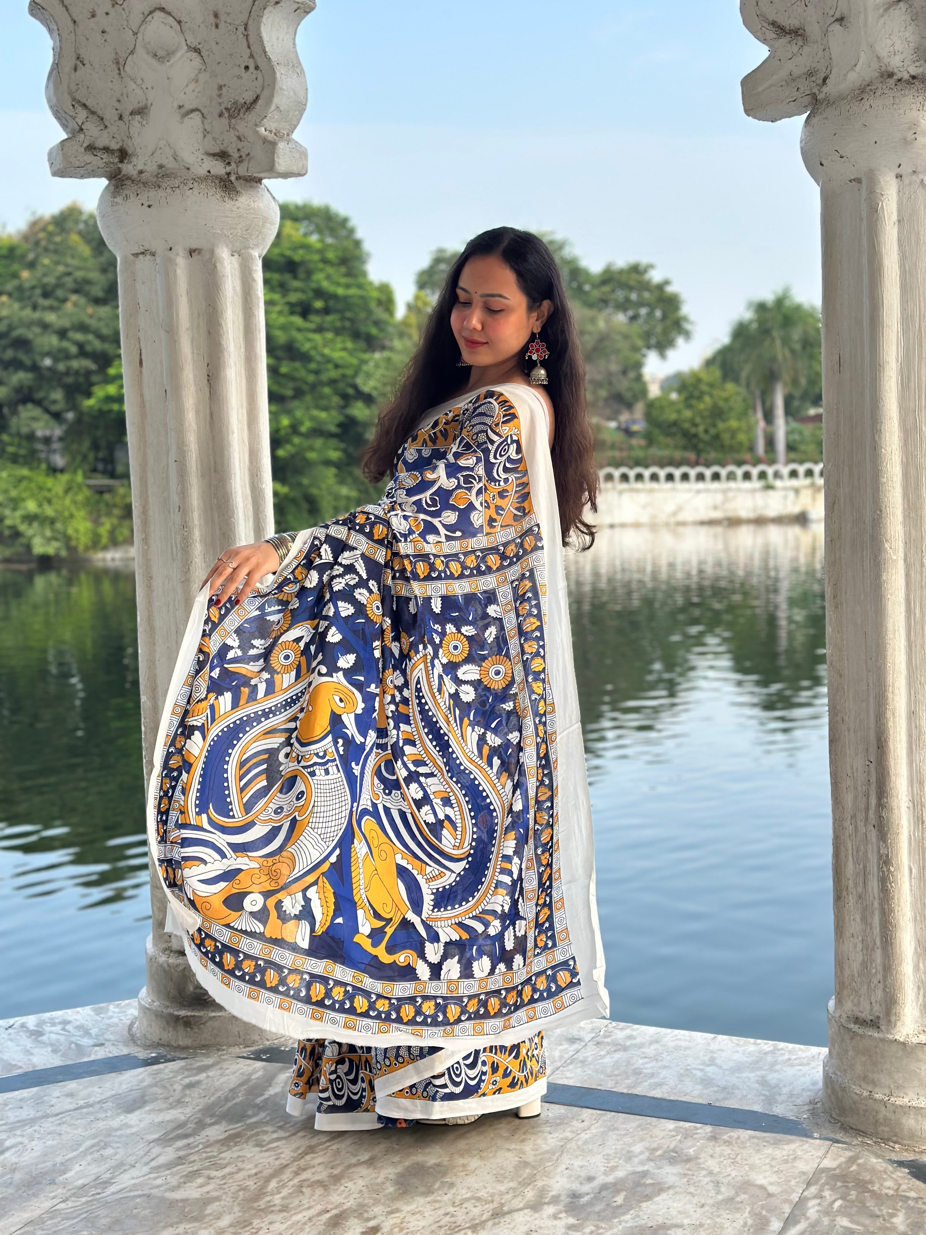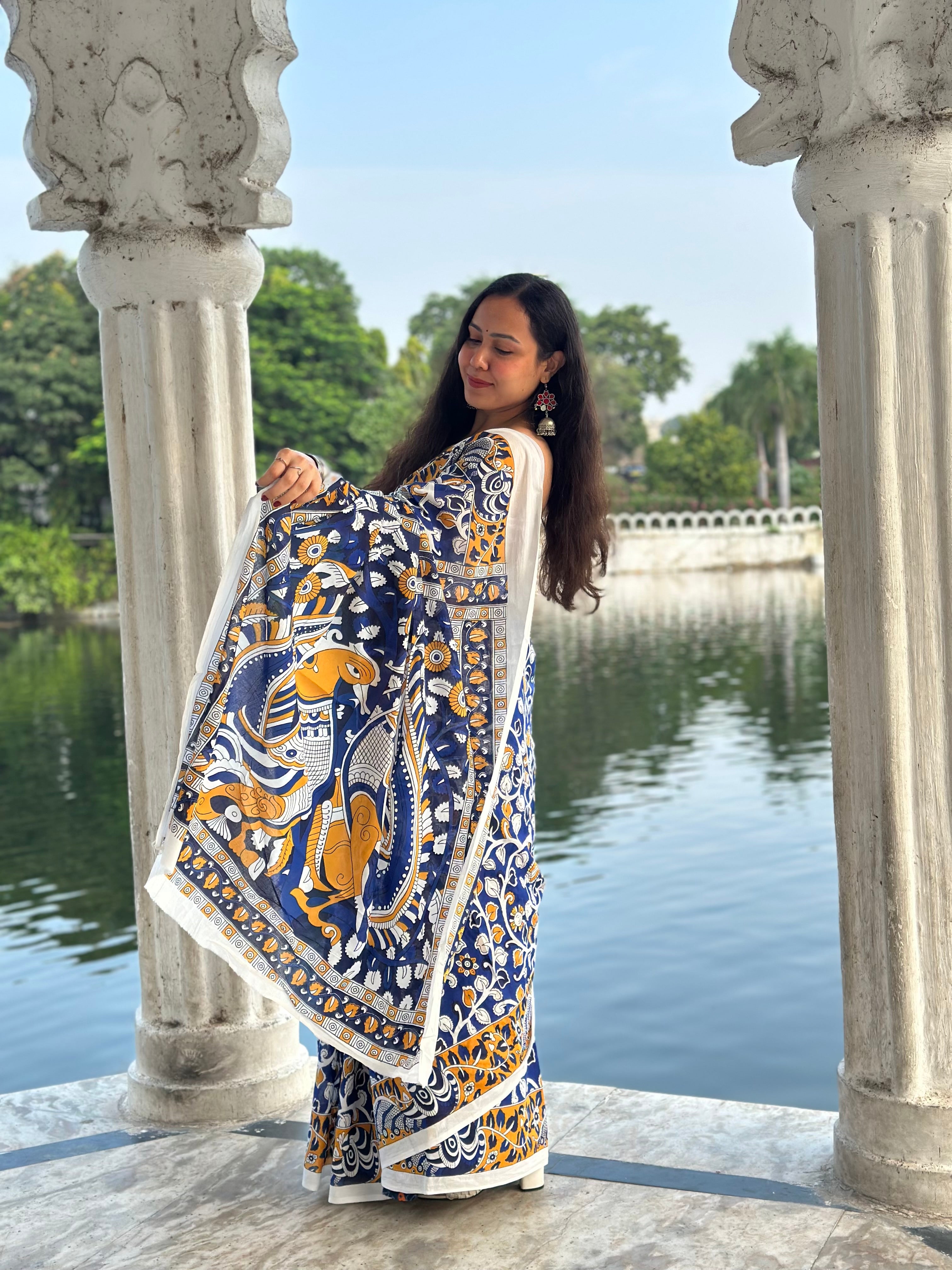 Experience the captivating allure of this kalamkari saree, where a delicate white base complements intricate blue motifs. Each design tells a story, blending nature's tranquility with artistic expression. The serene blue hues evoke calm, making this saree perfect for festive occasions or everyday elegance, blending tradition with modern sophistication.
