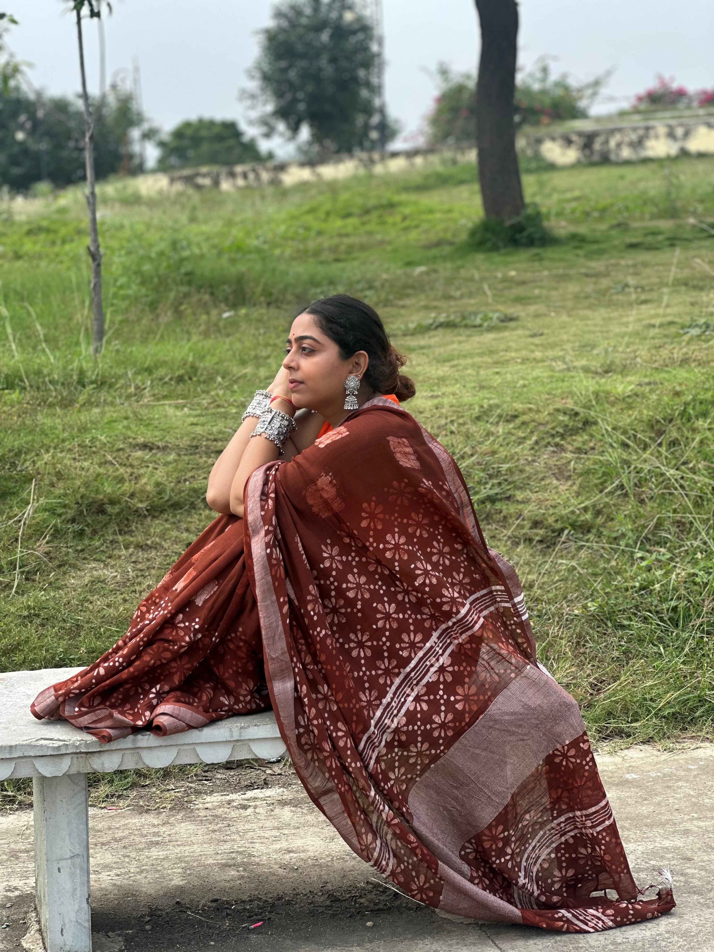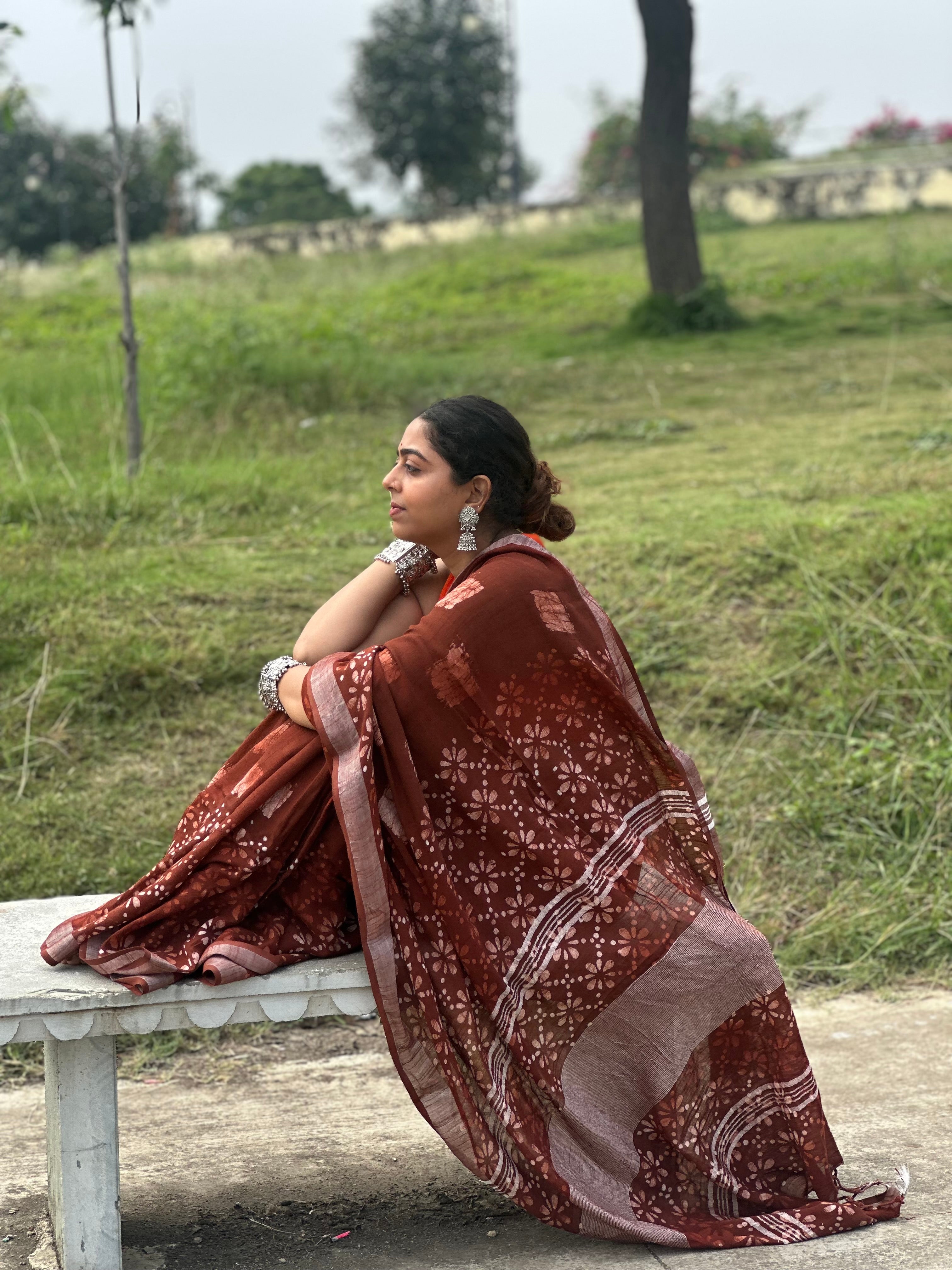 Indulge in the rich sophistication of this brown batik saree, crafted from luxurious linen that flows effortlessly. The deep mocha hue pairs beautifully with intricate batik patterns, evoking earthy elegance. Perfect for formal occasions or casual outings, this saree blends natural charm with timeless grace for a refined, versatile wardrobe statement.