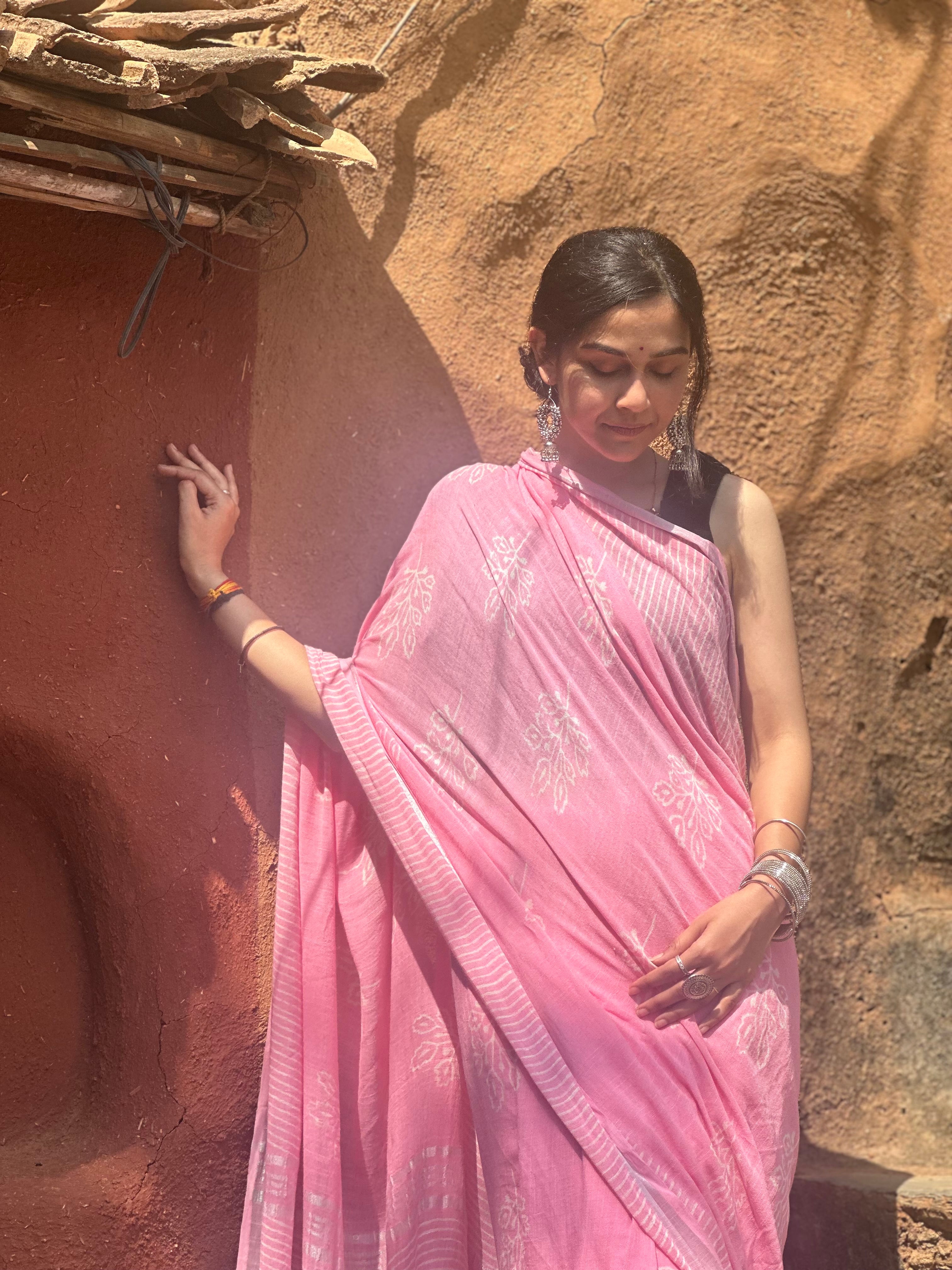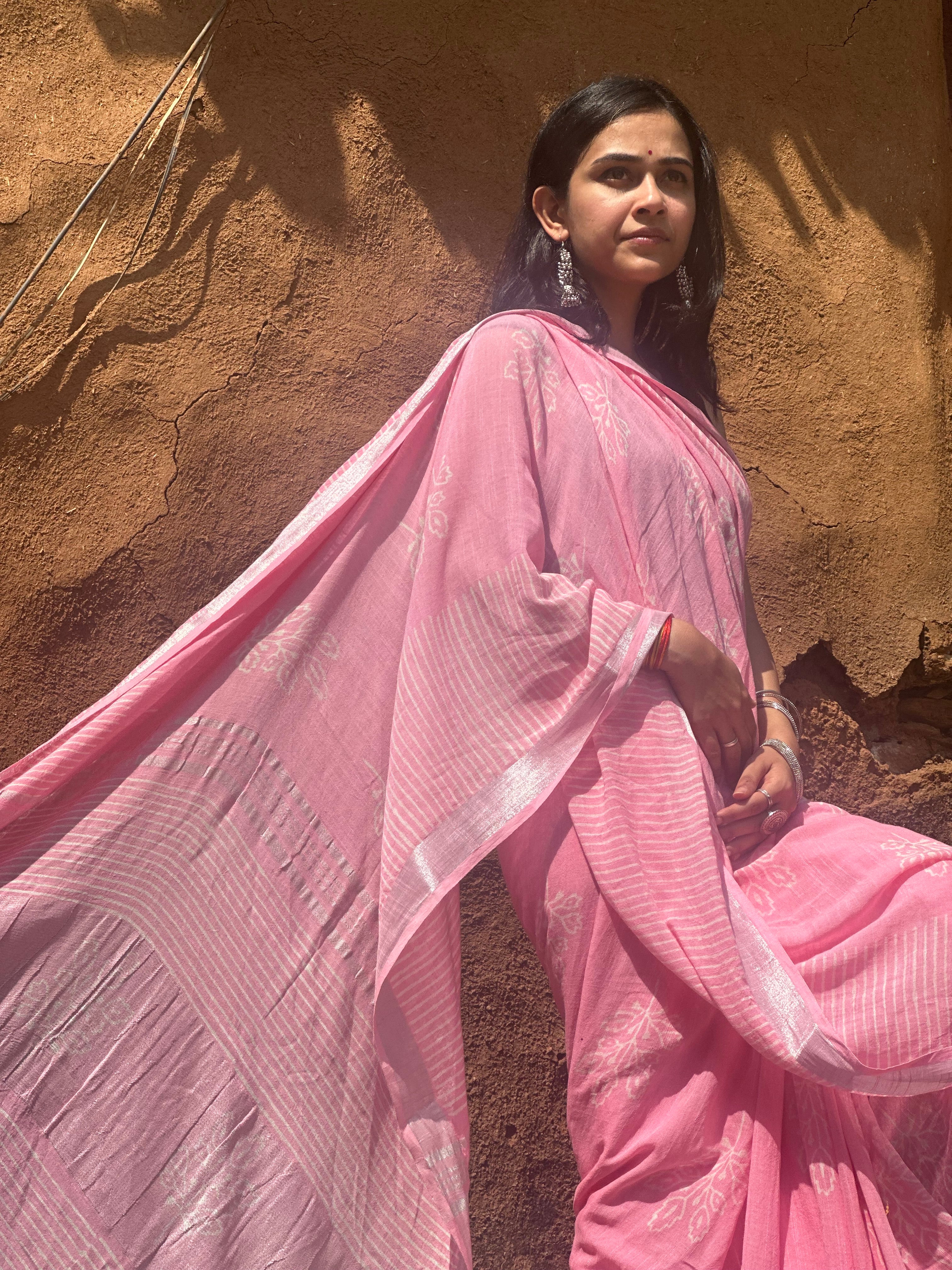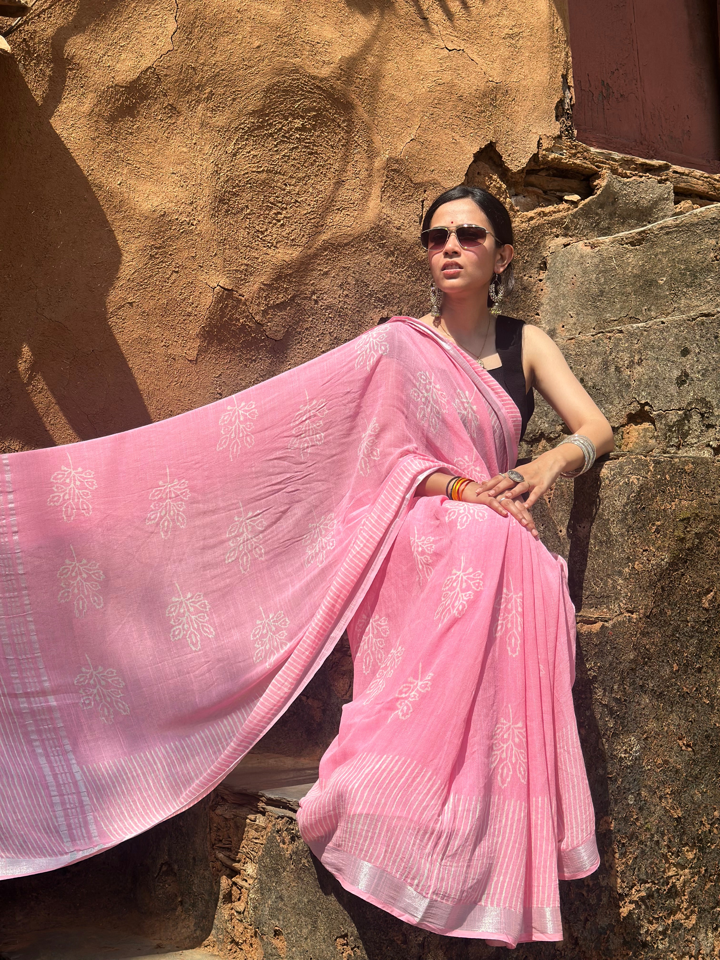 Embrace the gentle allure of this baby pink batik saree, crafted from luxurious linen for a light, airy feel. The soft blush hue is complemented by intricate batik patterns, creating a serene, feminine look. Ideal for casual outings or special gatherings, this saree blends elegance, comfort, and timeless charm effortlessly.
